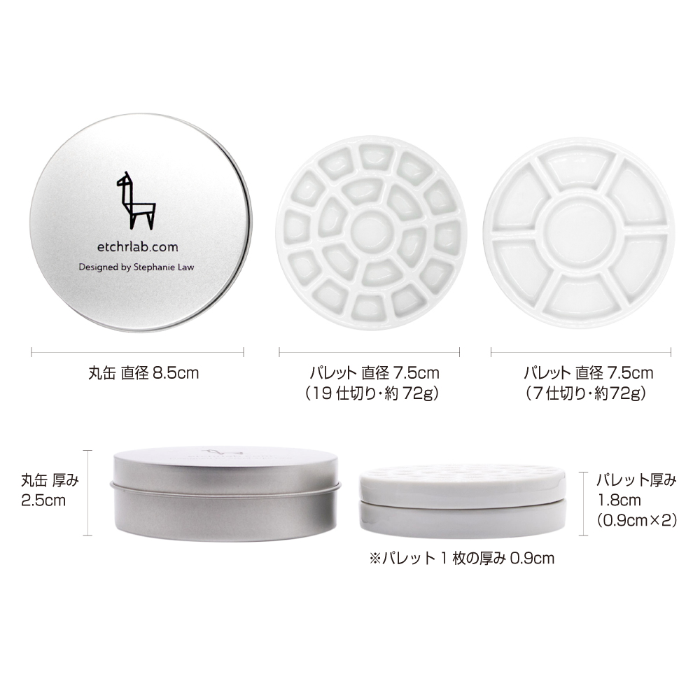 オーストラリアでアーティストと共にアーティスト専門用品を開発するEtchr Labと世界クラスで有名な水彩画家のステファニー・ロー(Stephanie Law)が共同で開発したエッチャー ミニパレットに「19仕切り」タイプが仲間入りしました。持ち運びに便利なカワイイ陶器のパレットです。サイズ:φ85×25mm(丸缶) φ75×9mm(パレット2枚共通)重 量:199g(全体) 72g(19仕切りパレット) 72g(7仕切りパレット)