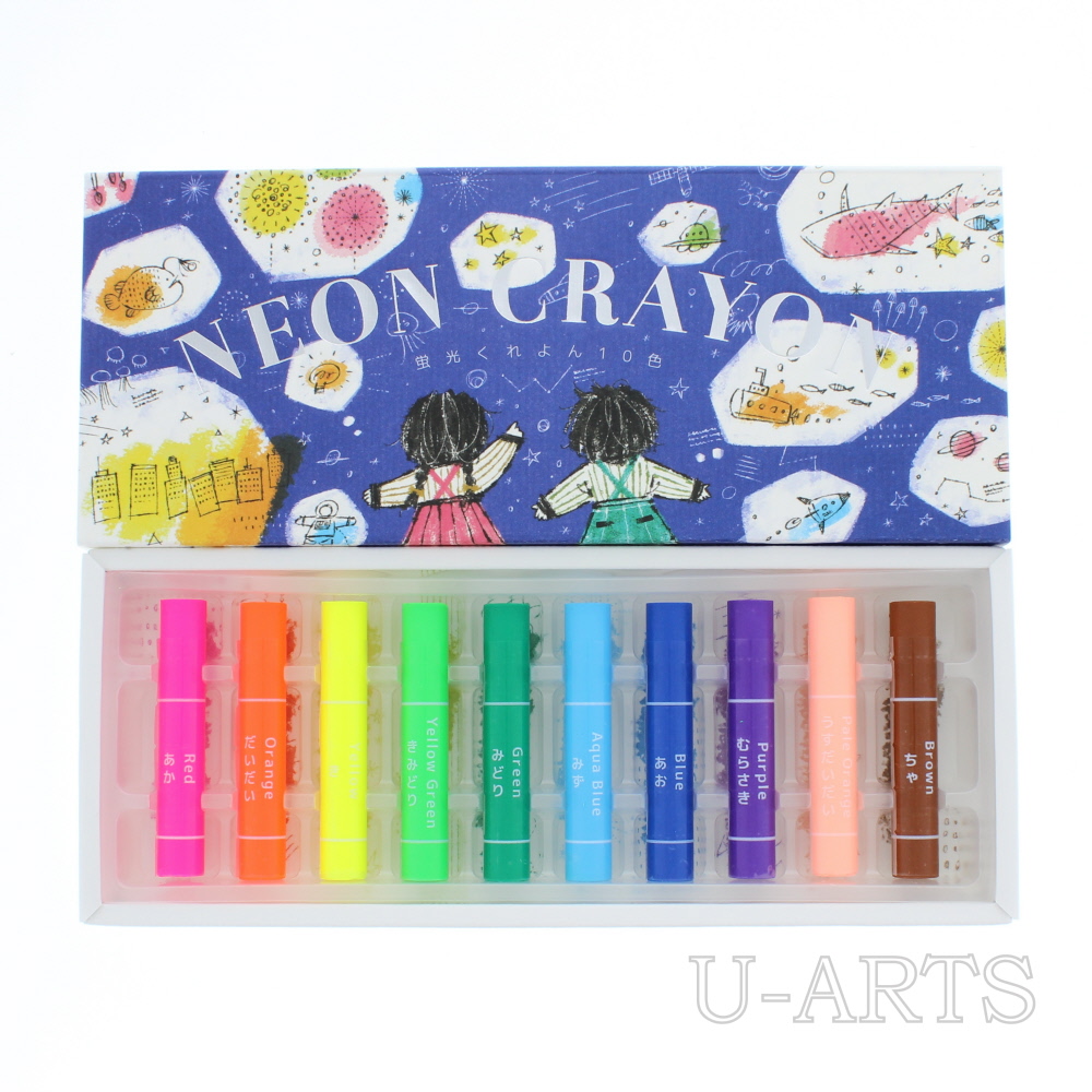 鮮やかな蛍光色のクレヨンで、線画の上に重ねて塗ると下絵が透け、透明感のある発色。やわらかく、なめらかな描き心地で、重ね塗りによる混色も楽しめます。セット内容:オイルゲルクレヨン10色(あか・だいだい・き・きみどり・みどり・みず・あお・むらさき・うすだいだい・ちゃ)対象年齢:3歳以上