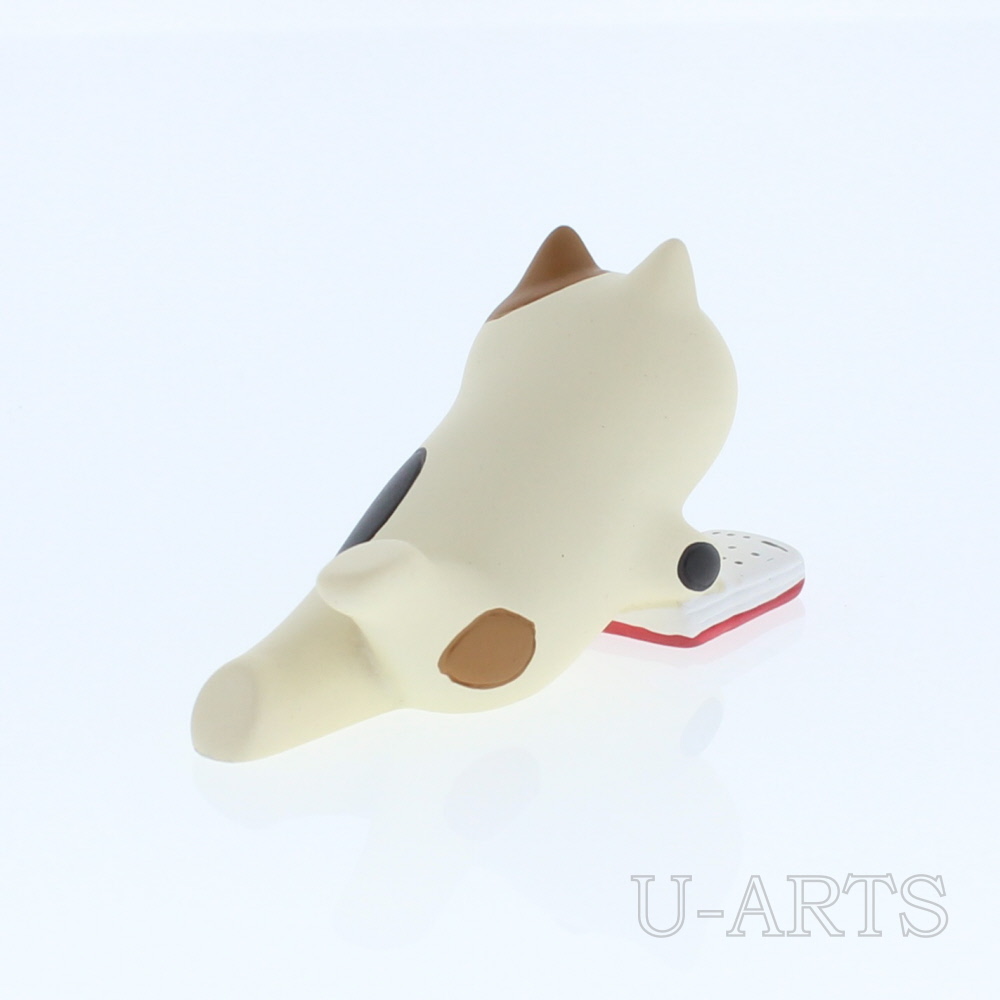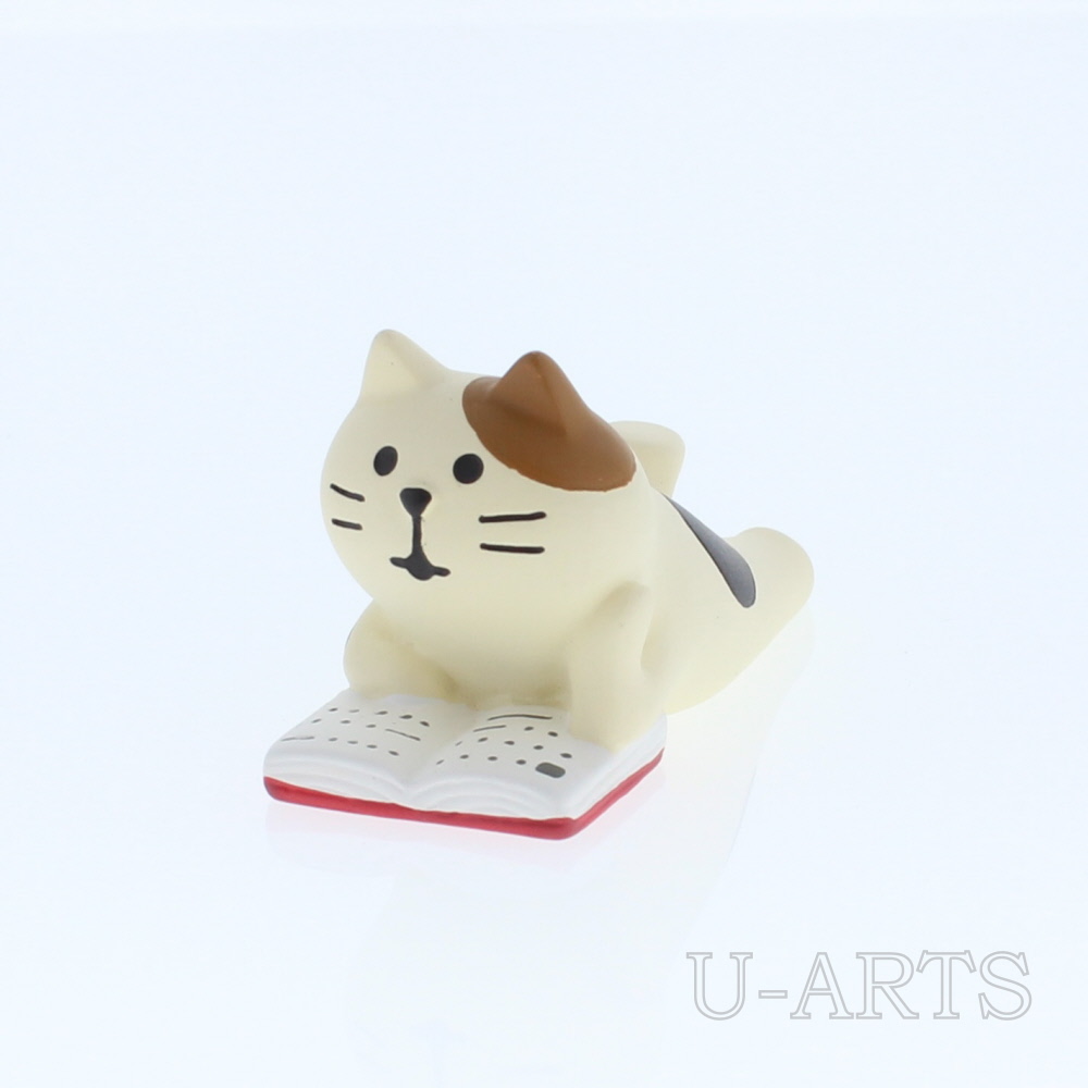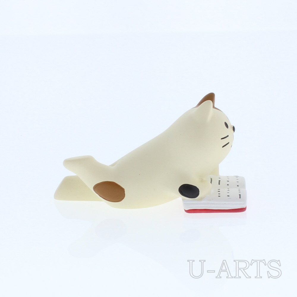 ゴロンとリラックスしながら読書を楽しむ三毛猫さん。続きが気になってついつい夜ふかしてしまうね。材質:ポリレジン製サイズ:約24×53×h30mm