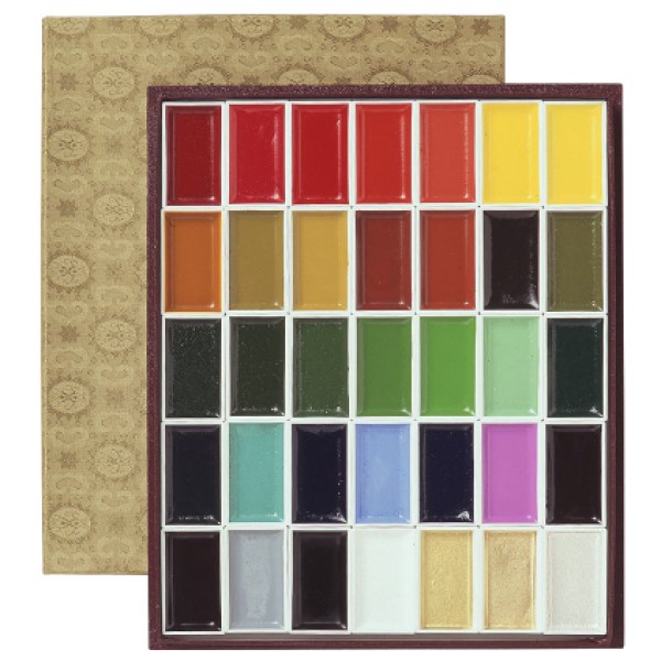 吉祥の顔彩35色セットです。顔彩とは、水干絵具やチューブ絵具と同じ顔料に、デンプン質と膠分を加えて練り混ぜて乾燥させたものです。水で溶いて使うことができ、その扱いやすさから日本画材料の中では特に普及しています。色調は透明型淡彩色で、俳画、南画、日本画調繊細画などのほか、ハガキなどの挿し絵、岩絵具の下塗り、写生用などにも使用します。