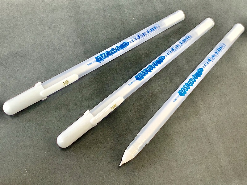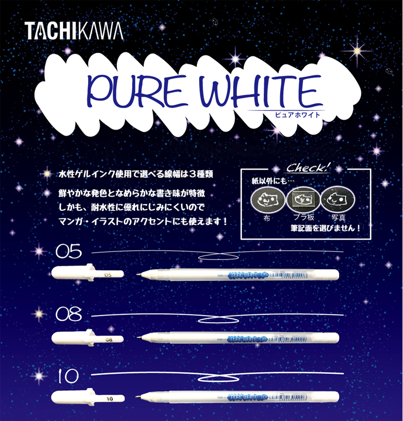 鮮やかな発色と滑らかな描き心地のホワイトゲルボールペン。乾くとさらに白さが増すので、手軽にイラストのハイライトなどが描けます。太さは「0.5㎜」「0.8㎜」「1.0㎜」の三種類。紙以外にも、布、プラ板、写真にも書けます。太さ:0.8㎜白ゲルインク