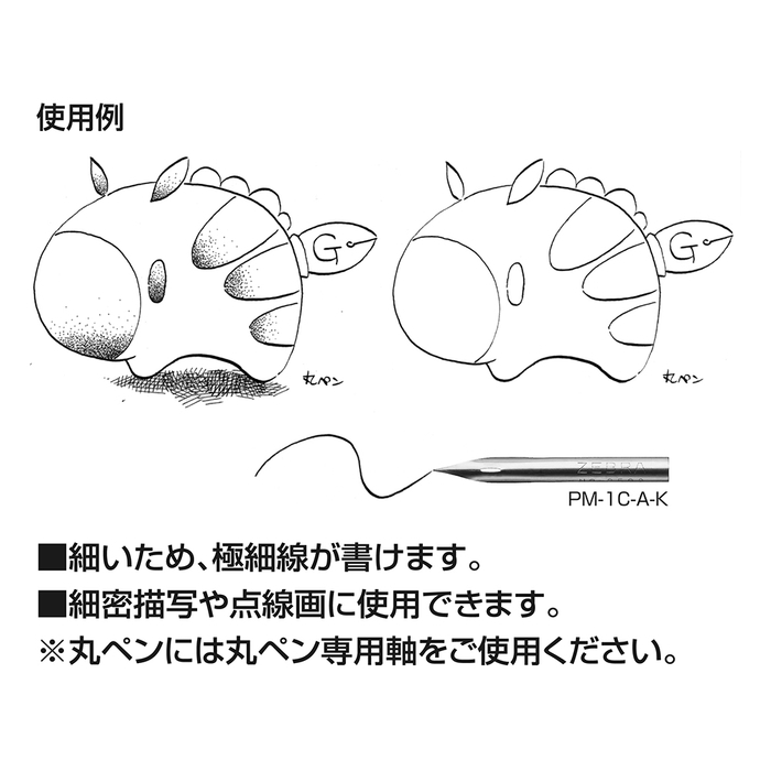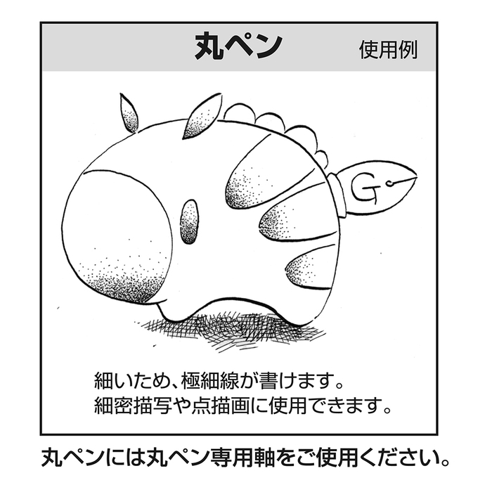 ゼブラの丸ペン(Aタイプ)です。ペンに弾力があり細い線が引けます。紙に引っかかりがあるため使いこなすのにやや練習がいります。プラケースに10個入り。