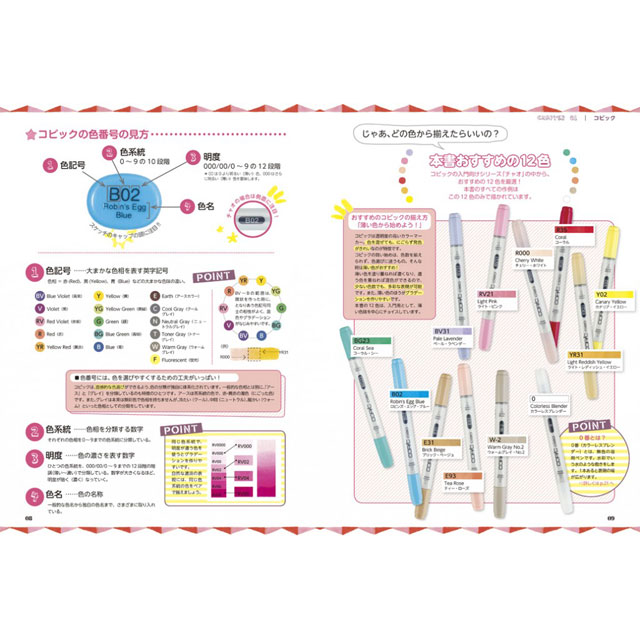 コピック初心者の方のための公式ガイドブックです。コピックスタート12色セットを使って初心者の方が迷いがちな画材の選び方から、ぼかしやグラデーション、混色といった基本テクニック、さらにキャラクターの塗り方までを、この1冊にコンパクトにまとめました。その他、塗り方やカラー、柄のバリエーションアイデアも豊富に収録。たった12色でコピックの魅力を存分に楽しめます。