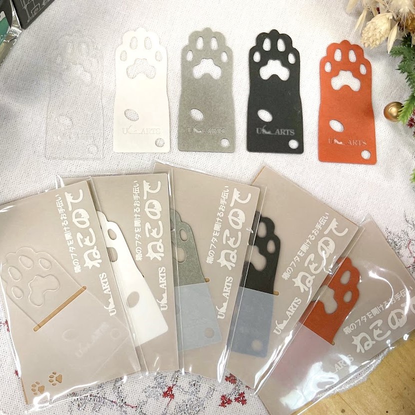 NICHEさんのインクオープナー【ねこのて】、 ユーアーツオリジナルver.を作って頂きました。 インクの箱等の紙箱を開けるお手伝いをしてくれる【ねこのて】です。 可愛い箱や綺麗な箱を破損しないで開けたい時に、ねこのてを借りてあげてください。 丈夫な硬いファイバー紙で出来ています。 ねこのて【はいいろ】1個入り 作品サイズ:縦7センチ、横3センチ、厚さ1ミリ 包装サイズ:縦10センチ、横6センチ、厚さ2ミリ 作品素材:ファイバー紙 包装素材:ポリプロピレン