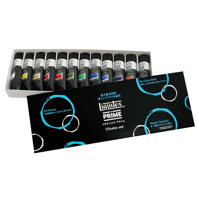 リキテックス最上位ランクのアクリル絵具「リキテックスプライム」の12色セットです。透明度の高いアクリル樹脂でできており、非常に色鮮やか。従来のアクリル絵具と違い、乾燥による色の変化を感じさせません。