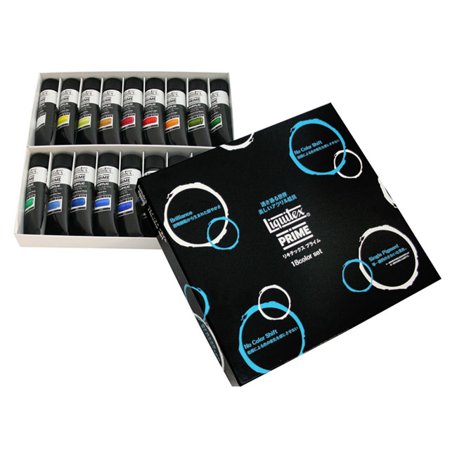 リキテックス最上位ランクのアクリル絵具「リキテックスプライム」の18色セットです。透明度の高いアクリル樹脂でできており、非常に色鮮やか。従来のアクリル絵具と違い、乾燥による色の変化を感じさせません。